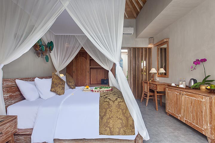 Each room has one king size bed with mosquito net, wardrobe, safety box, front table with drawer and chair, private bathroom each room with bath tub and standing shower.